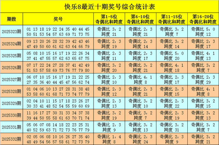 福彩快乐8第2025332期开奖回顾奖号:02 05 06 08 10 16 26 27 35 40 48 49 54 56 57 58 61 72 73 79,其中奖号奇偶比为8:12,大小比为8:12,跨度为77。
